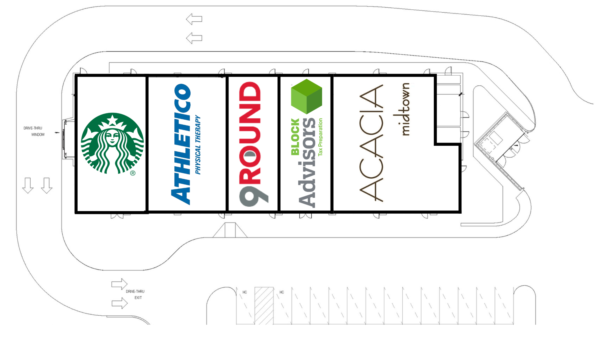 Tenants include: ACACIA midtown, Athletico, Block Advisors, Starbucks, and 9Round